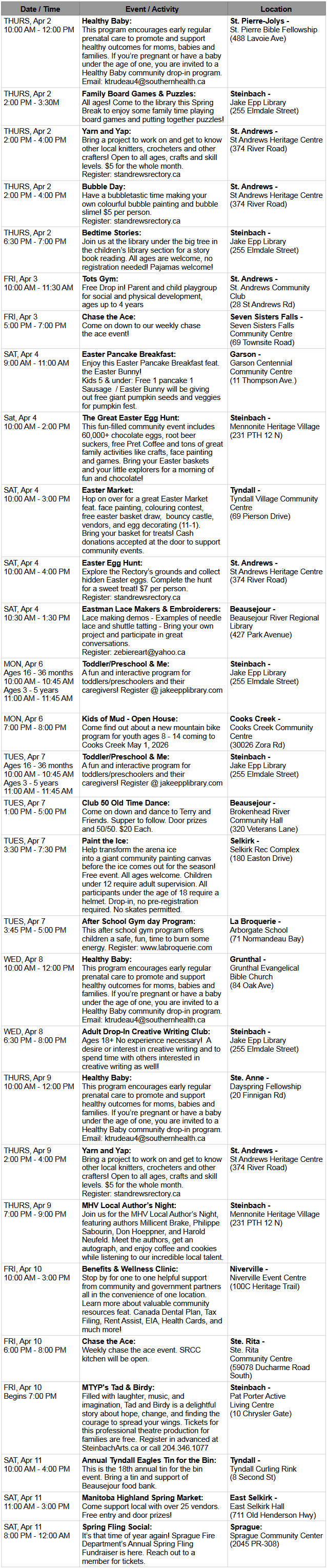 Do you have an event you'd like to share? If you are hosting a community market, fundraiser, festival, or public meeting in the River North, Eastman, or Boreal & Boundary regions, please send us the details (Event Name, Location, Date, Time, and a brief description) to be featured in an upcoming issue! Email [email protected].