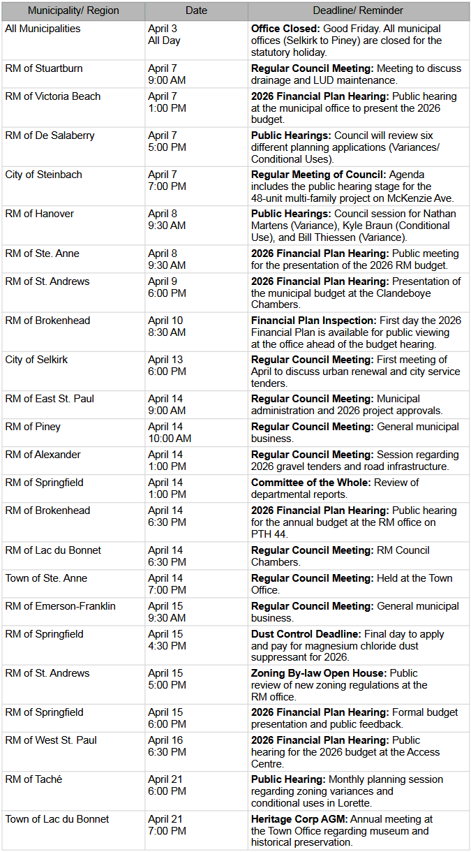 Good morning to our readers across the Red River North, Eastline, and Boreal Boundary. As we step into April 2026, our region finds itself at a crossroads. The transition from winter to spring is never just about the weather; it is about the shifting landscape of our towns, the safety of our roads, and the provincial "fiscal blueprint" that determines which of our local priorities move forward and which are left waiting. From 100-lot subdivisions to the sobering finality of police oversight reports, this week’s report captures a community in motion.