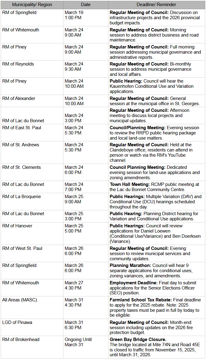 In the Boreal Boundary, we start the week with a collective sigh of relief as the Silver Alert for a missing Tyndall man ended happily with his safe return. This success story stands in contrast to a troubling whistleblower report out of Pinawa, where allegations of mistreatment at a seniors' facility have prompted an RCMP and health authority investigation. It is a reminder that protecting our most vulnerable remains our highest calling. Administratively, the region is deep in "spring cleaning." From the RM of Alexander opening its 2026 Voters List protection period to Brokenhead launching its summer student recruitment, the gears of municipal governance are turning at full speed. As Lac du Bonnet launches its "Fire Smart" survey to prepare for the wildfire season, it’s clear that our eastern municipalities are not just reacting to the present, but actively insulating our boreal communities against the risks of the future.