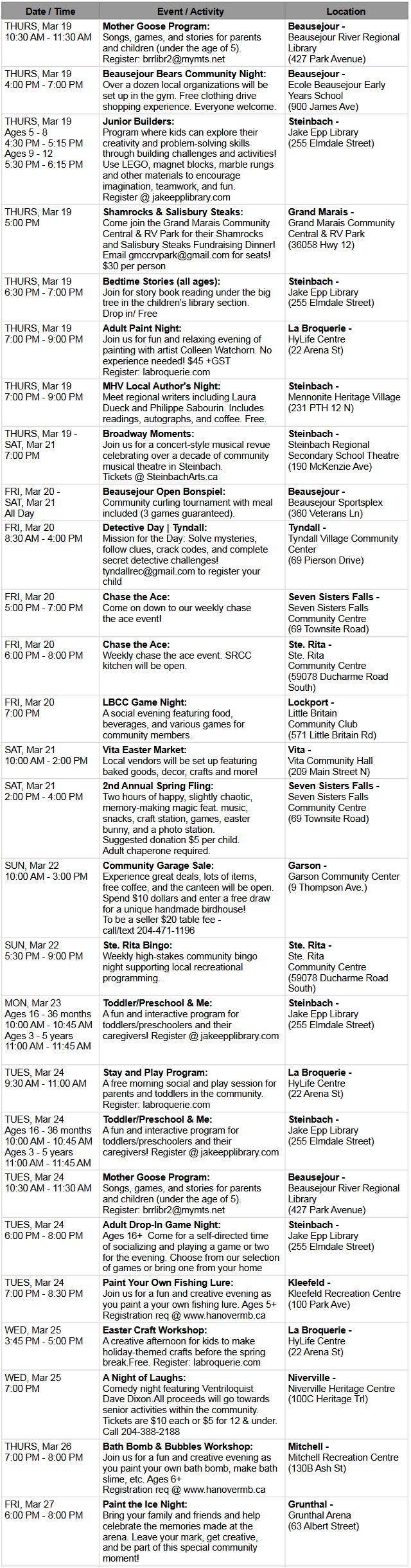 Do you have an event you'd like to share? If you are hosting a community market, fundraiser, festival, or public meeting in the River North, Eastman, or Boreal & Boundary regions, please send us the details (Event Name, Location, Date, Time, and a brief description) to be featured in an upcoming issue! Email [email protected].